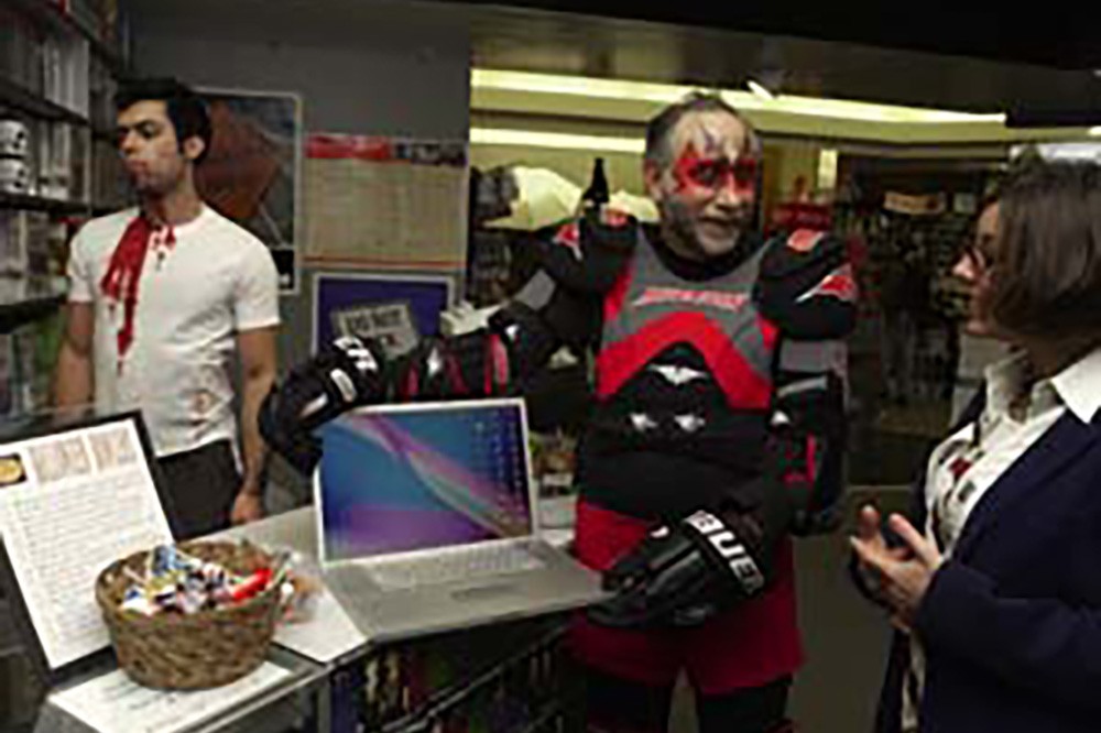 Mark Hillengas, assistant manager of Campus Connectionsâ computer sales deptartment, talks with student Sarah Messina during the annual Halloween extravaganza at the bookstore, Oct. 29. In the background, student Anthony Russo works despite his obviously painful âinjuries.â -