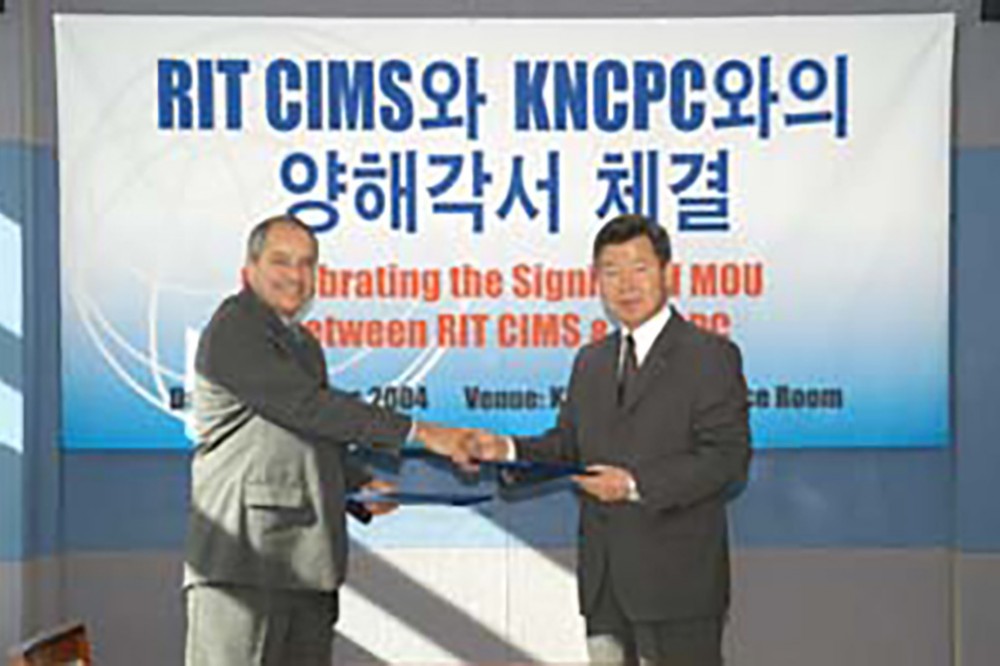 Nabil Nasr (left), director of RIT's Center for Integrated Manufacturing Studies, celebrates the signing of an agreement with the Korea National Cleaner Production Center. Under the leadership of Chang-Hyun Yoon, the Korean center will collaborate with CIMS on the development of remanufacturing and resource recovery technologies. -