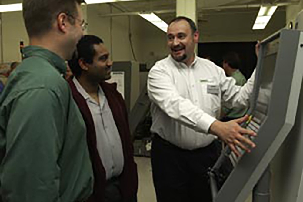 Giovanni Principe, an engineer with DMG America Inc., far right, demonstrates a machine tool to Pat Derleth, far left, and Rohan Sicard, both of East Side Machine Inc., in RITâs Brinkman Manufacturing Lab in the Center for Integrated Manufacturing Studies. DMG representatives visited RIT on Oct. 28 for an open house commemorating the companyâs equipment consignment and new partnership with RIT. -