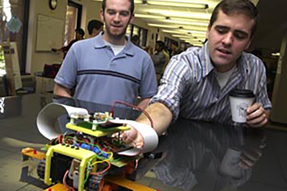 RIT computer engineering students James Ledwith (left) and Evan Clark demonstrate their senior design project, a minefield-traversing robot, Oct. 28 along with 15 other student projects. Robotic creations included an autonomous parallel-parking vehicle, a computerized firefighting vehicle, an obstacle-avoidance vehicle, an object-tracking camera system, a remote residential temperature-control system and âMailBotââa computerized mail-delivery system. -