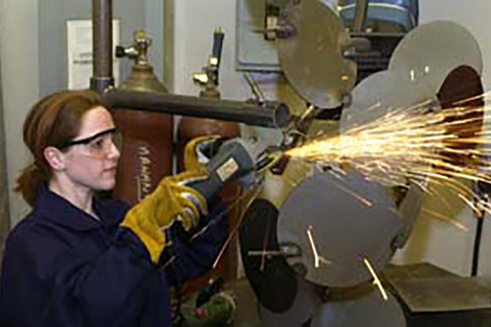 Sparks fly as Erica Sacheli, a third year student from Rochester, works to complete the final project for her Welded Sculpture class in RIT's School of Art. During 10 weeks of training, Sacheli and her fellow students get to combine steel with their unique visions to create works of art. Mahany Welding Supply in Gates donates its facilities, which feature the latest in welding technology, to members of the class. Mahany's staff has been on hand throughout the period to help students turn their visions into reality.