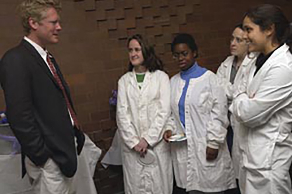 Geneticist, author and filmmaker, R. Spencer Wells visits RIT to talk about his groundbreaking research in population genetics that traces humanity back to a single ancestor. Wellsâ workâthe subject of a PBS National Geographic documentaryâfollows humanityâs migration from Africa to the far reaches of the world. Here, Wells (left) talks to students Rebecca Rigden, Chalonda Rolle, Jody Pape and Daniela Palacio. -