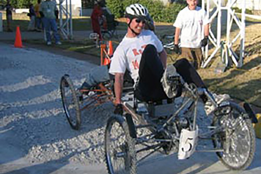 Andrew Street pushes hard to the finish as the RIT Moon Buggy nears the finish line at the Great Moon Buggy Race held April 3 in Huntsville, Ala. Despite breaking three chains in competition, the team went on to finish in 12th place, posting their best finish yet at the national competition. -