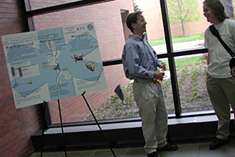 Fifth-year software engineering student Chris Boncha discusses his senior project with a fellow student at the Software Engineering Senior Projects Poster Day, May 7. A total of seven projects were on display, including an online co-op evaluation system and a telephone fraud monitoring and detection system. View the projects at http://www.se.rit.edu/current_projects.php. -