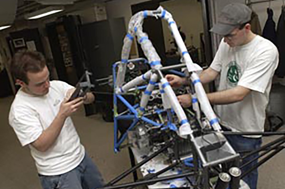Joe DâAmato, left, and Justin LaChausse, mechanical engineering majors and members of RITâs Formula SAE team, work on this yearâs newly designed, student-built racer in the mechanical engineering departmentâs machine shop on April 28. -
