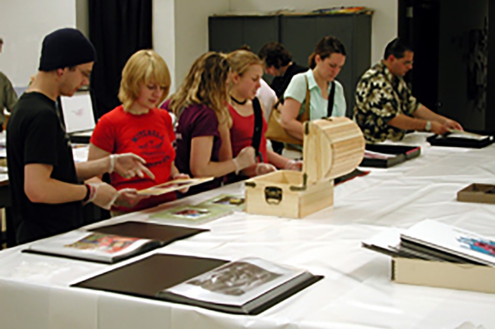 Students browse through illustration portfolios at a walkthrough event on May 13. The illustration, medical illustration, art education, and fine art studio departments all opened their facilities for tours and curious onlookers. -