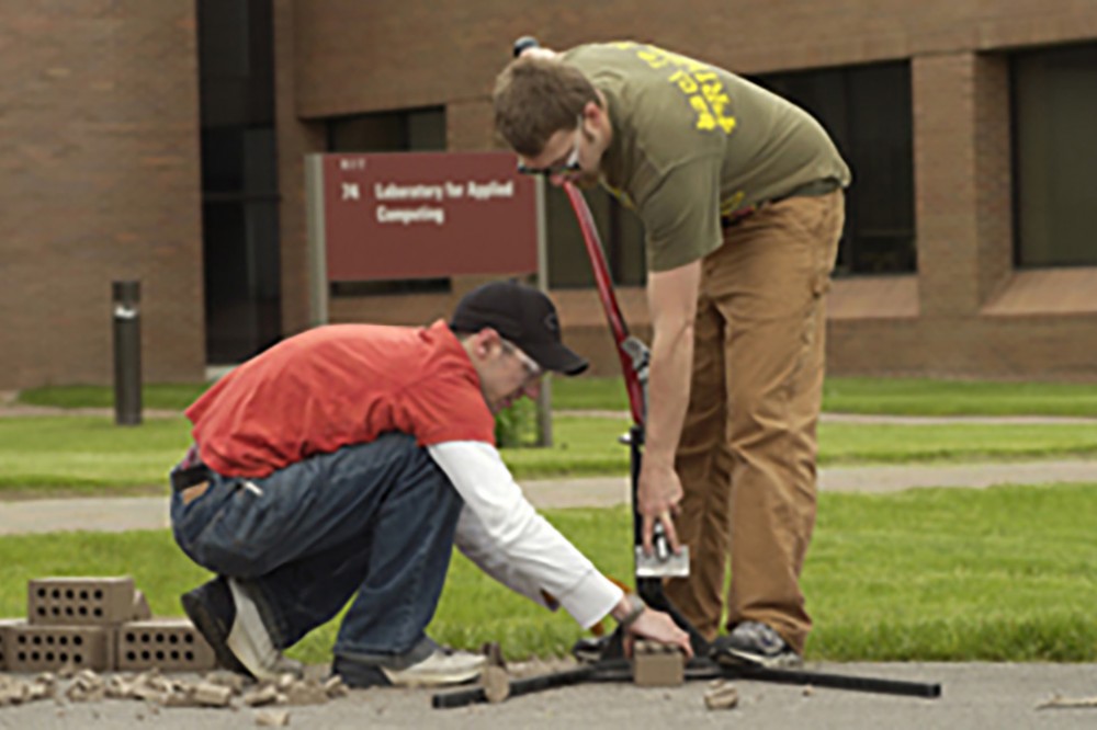 Ed Alexander, left, and Chris Gotie, mechanical engineering technology majors, prepare to smash a brick as part of an end-of-quarter project in Machine Design class on May 21. In place of a final exam, student teams designed and built brick-bashing devices in RIT's first-ever "Brick Bash." Course instructor Marty Gordon says the competition also served as a stress reliever for students. Bricks were donated by Miller Brick Co. -