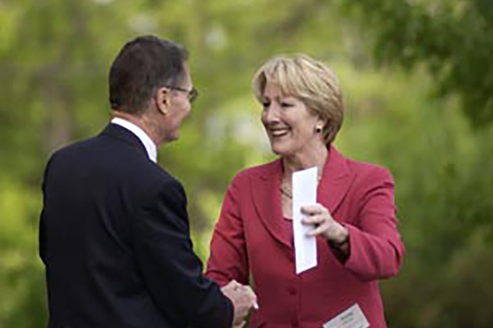 RIT President Albert Simone accepts the first installment of a $2 million Xerox grant from Anne Mulcahy, Xerox chairman and CEO, during a reception preceding RIT's convocation ceremonies, May 21. The grant will help fund innovation in technology, encourage leadership development and to promote diversity. -