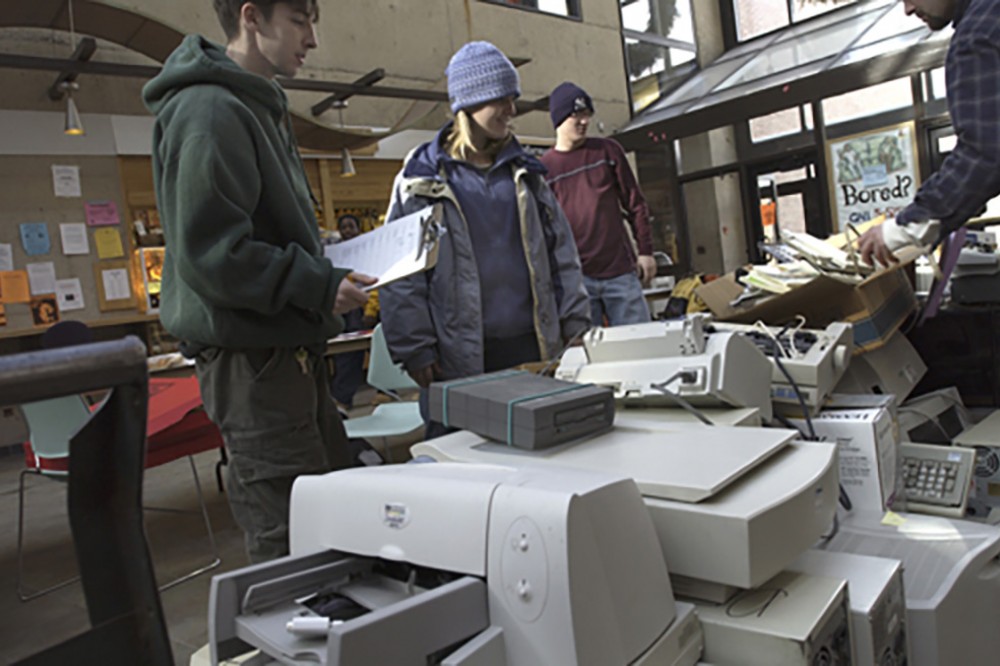 RIT environmental management and safety students, from left, Ken Smith, Kate Cassim and Brian Marcelli, look over some of the used electronic equipment--such as computers, monitors, TV sets and cell phones--that were turned in to RIT's Student Environmental Action League as part of Electronic Waste Recycling Day on Jan. 16.