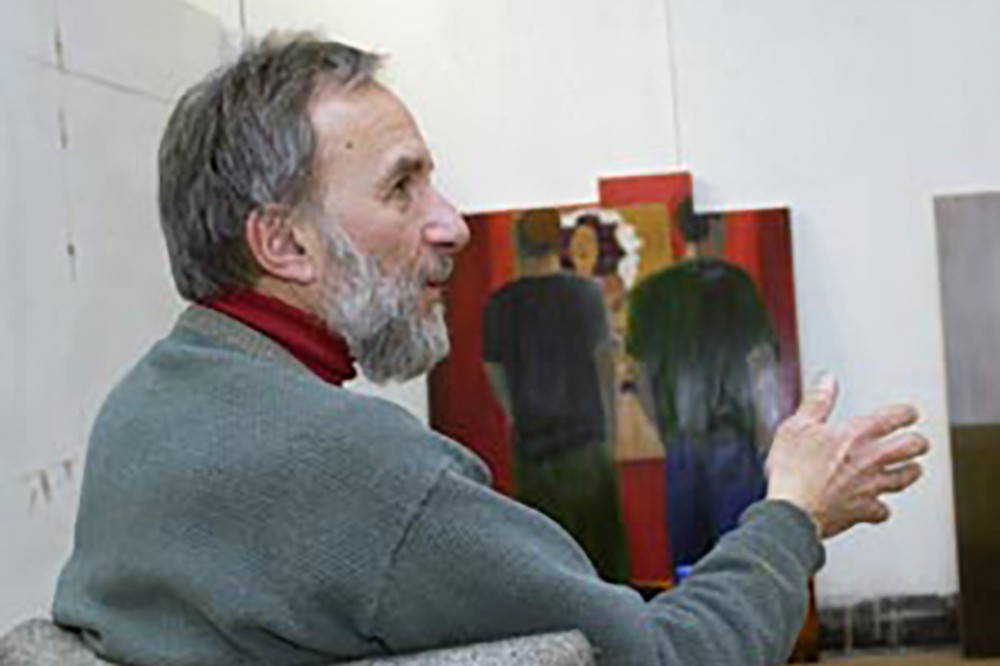 Jerome Witkin, one of America's finest figurative artists, offers critiques of students' work in Alan Singer's painting class at RIT, Jan. 29. Witkin, known for his historical narratives, spoke about his paintings during his visit to campus. -