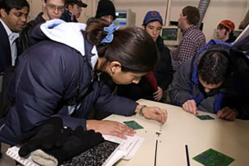 Gabriella Noriega, a second-year electrical engineering student, manually places a component on a circuit board in a lab session in RIT's Center for Electronics Manufacturing and Assemby on Feb. 4. -