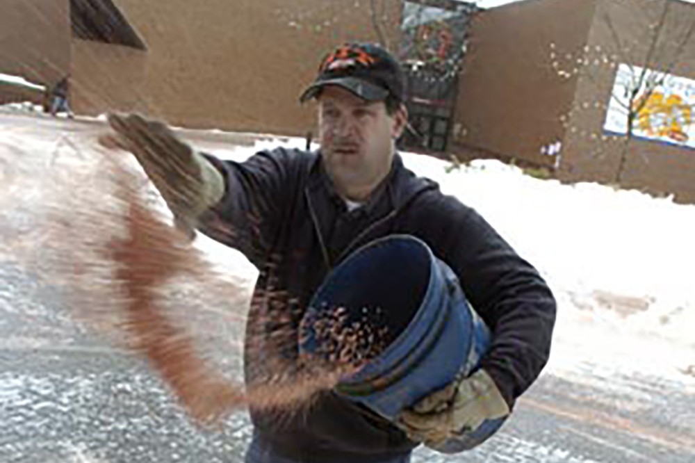 Jeff Flowerday of RIT's Facilities Management Services spreads potassium chloride near Frank Ritter Ice Arena on Feb. 3. The reddish-brown substance is an inorganic chemical fertilizer that melts snow and ice more efficiently and is kinder to concrete and plants than traditional road salt. -