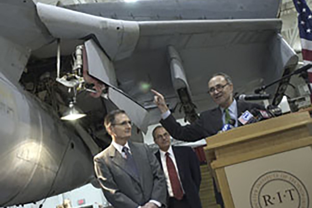 U.S. Sen. Charles Schumer (right) visits RIT's Defense Modernization and Readiness Program and its latest research subjectâan A-6E Intruder planeâon Dec. 3 at the Center for Integrated Manufacturing Studies. Research on this plane will lead to developing technologies to benefit aging commercial aircraft and other military aircraft, says Nabil Nasr, CIMS director (center). Also pictured, RIT President Albert Simone (left). -