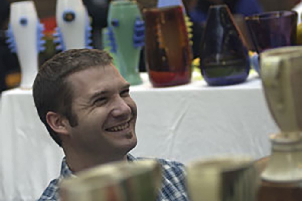 RIT student Ron Mooney sits among hand-crafted glass and ceramic creations at the annual School for American Crafts holiday sale, Dec. 11 in the Student Alumni Union. -
