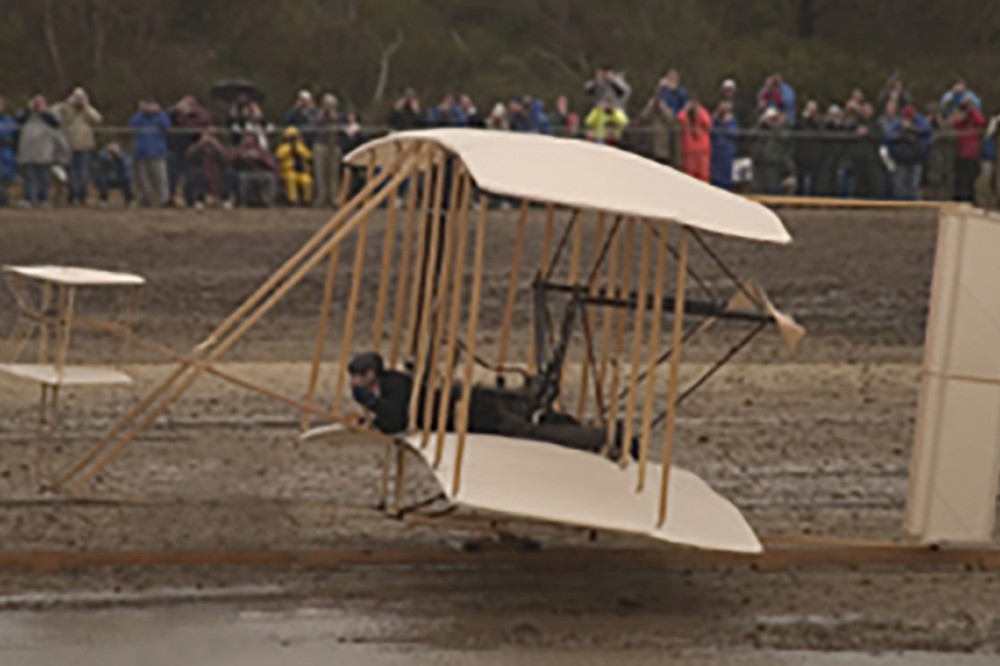 RIT's Kevin Kochersberger attempts to re-enact the Wright brothers' first powered flight on Dec. 17, the 100th anniversary of the Wrights' historic flight, near Kitty Hawk, N.C. Kochersberger, associate professor of mechanical engineering, helped build the reproduction 1903 Wright Flyer and was named a "Pilot of the Century" by the Experimental Aircraft Association. -