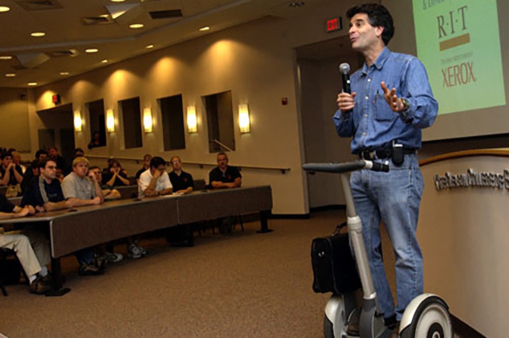 Dean Kamen, world-famous inventor of the Segway Human Transporter and founder of FIRST robotics competitions for high school students, announces at RIT on Oct. 11 the formation of Rochester FIRST, a partnership between RIT, Bausch & Lomb and Xerox that is bringing a regional FIRST robotics competition to Rochester in spring 2005. The event will draw thousands of people to the area. -