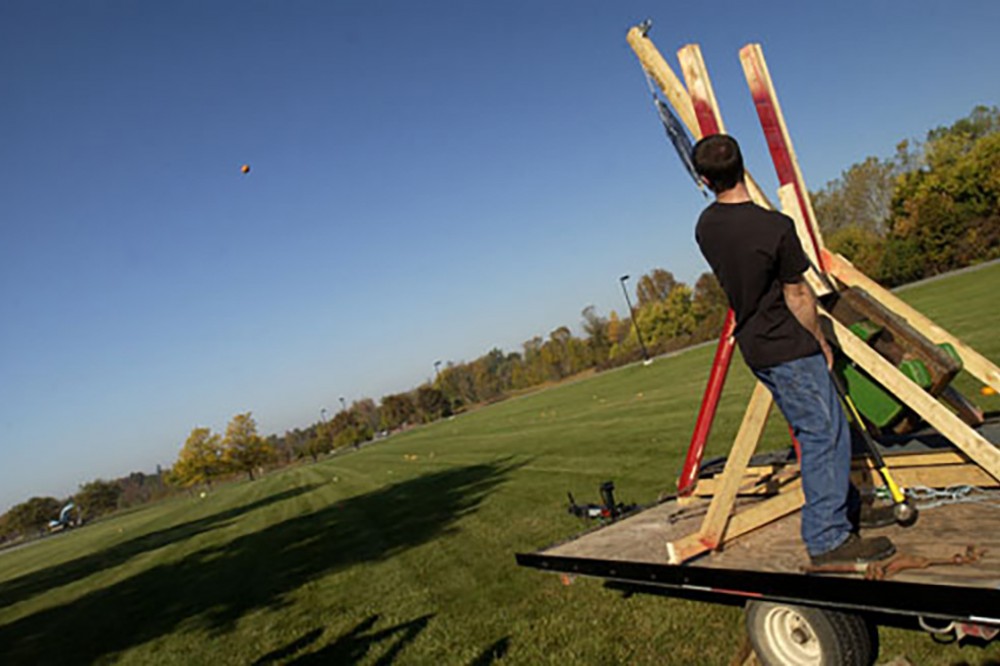 Using giant slingshots, catapults and other launchers, more than 100 students in teams of five tried hitting a target from 300 feet away during the second annual Pumpkin-Chuckinâ contest on Oct. 11. The contest was organized by the College of Applied Science and Technology. -