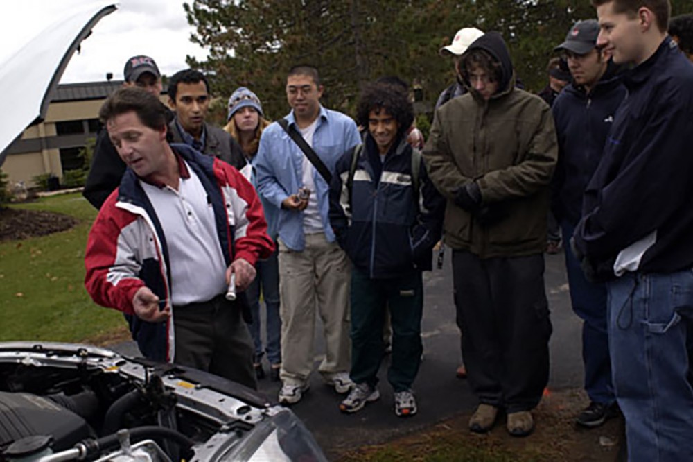 Certified Master Technician Mickey Riggio from Firestone gives RIT students some tips on winter car maintenance during a free car care clinic, Oct. 22. The car clinic, open to students, faculty and staff, was sponsored by RIT Campus Safety, the Center for Residence Life and Firestone Tire and Service Center. -