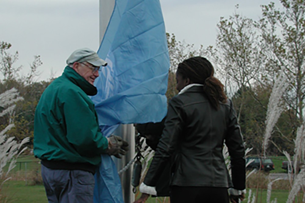 Bill Larsen, associate professor of civil engineering technology and advisor to the RIT Caribbean Students Association, and Natesha Greaves, fifth-year industrial and systems engineering major and president of the association, prepare to raise the U.N. flag at RIT on Oct. 24 to commemorate the 58th anniversary of the founding of the United Nations. -