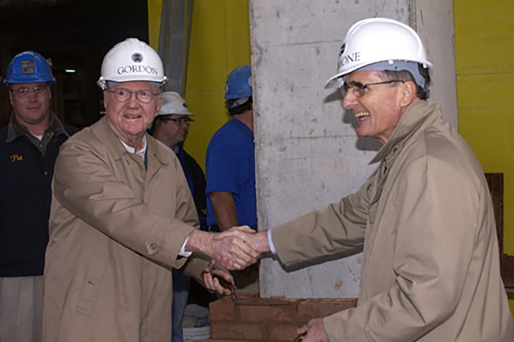 RIT President Albert Simone (right) and Lucius "Bob" Gordon shake hands after a brief brick laying ceremony at the Gordon Field House and Activities Center, Oct. 27. Gordon, an RIT trustee, is a key contributor to the field house and the person after whom it is named. -