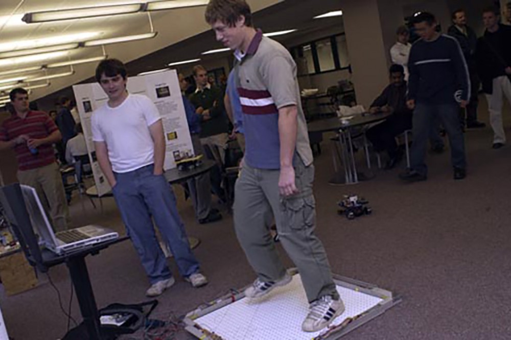 Computer engineering majors demonstrated senior-design, computer-controlled robotics inventions on Nov. 6. Included among the projects was a "contactless" dance pad using laser beams and controller signals on a modified version of the game, Dance Dance Revolution, shown above being tested by a student. -