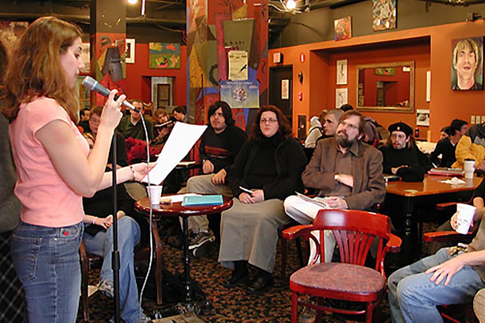 Liz Schifano, a fourth-year psychology student and member of Professor John Roche's creative writing class, reads her poetry, Nov. 11, at Java Wally's @ RIT's Wallace Library. -