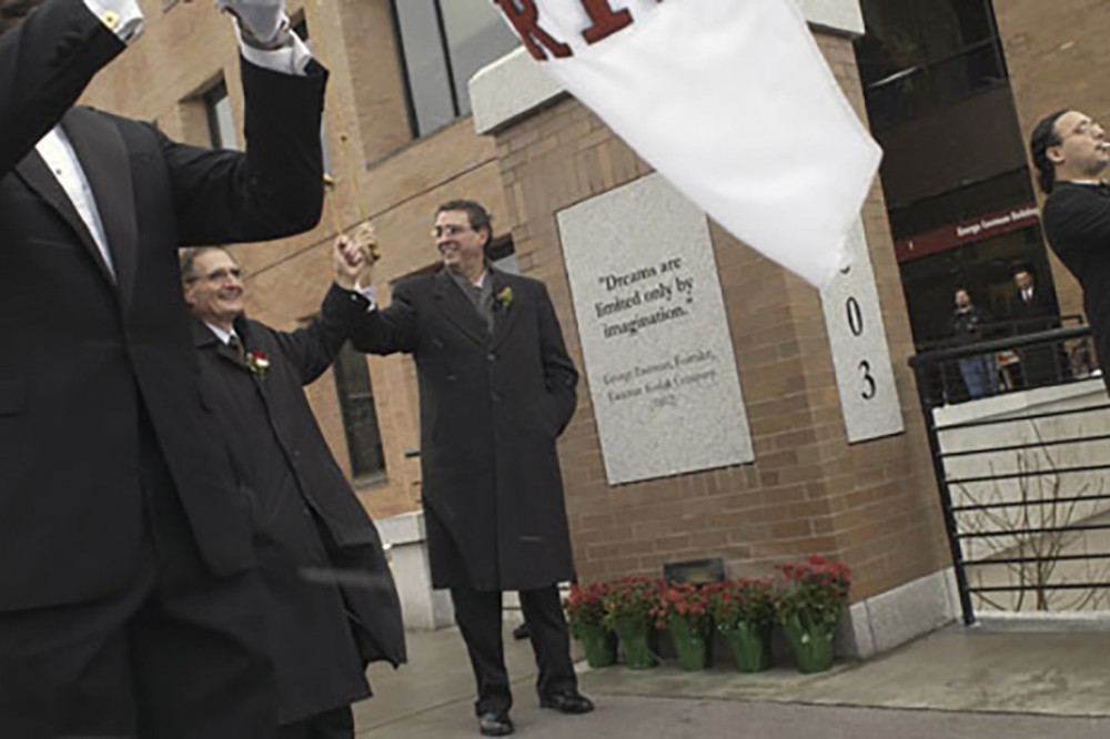 Daniel Carp, Kodak chairman and CEO and RIT alumnus (MBA â73) joins RIT President Albert Simone in unveiling the newly constructed archway and grand staircase to the Eastman Kodak Quad, Nov. 14. The area was formally dedicated to commemorate the long-standing partnership between Kodak and RIT. -