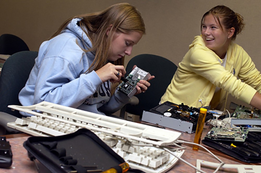 Jessica Oakes of Gasport, left, and Erin Race of Knoxboro have their hands full âdissectingâ computer keyboards. They were among 13 first-year, women engineering majors at RIT for the Kate Gleason College of Engineeringâs third annual âI Built My Computer @ RIT" workshops, Aug. 5-8. Students built computers that became theirs to keep and stayed in residence halls. Workshops were supported by Microsoft Corp.