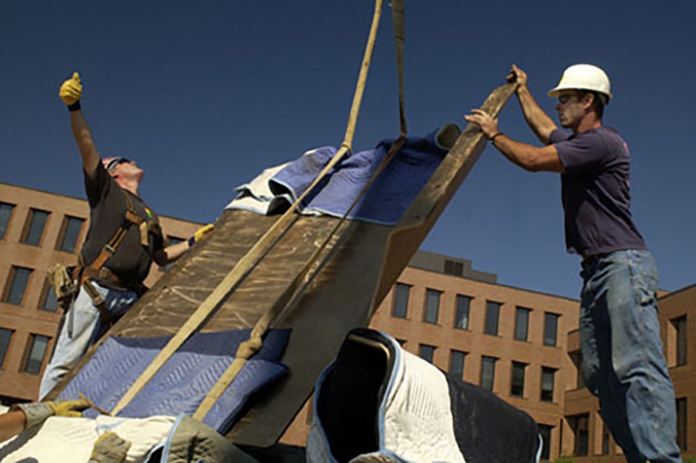 The final assembly of Albert Paley's The Sentinel sculpture at RIT is completed as five bronze pieces, each weighing 1,000 pounds, are bolted to the top of the towering structure, Aug. 19. -