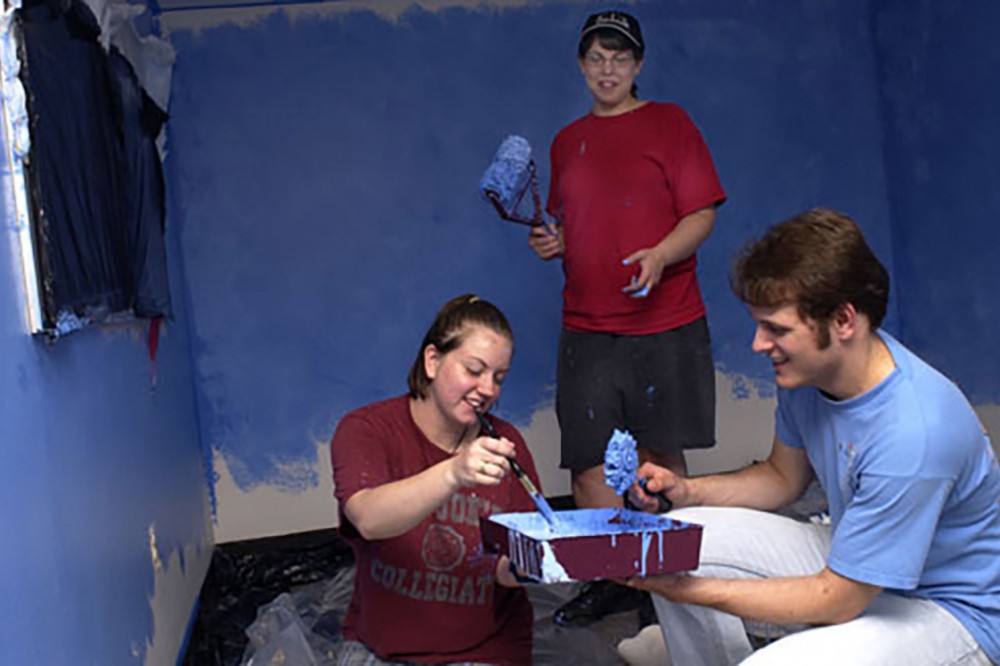 Members of Business Leaders of Tomorrow paint RIT's newest special interest housing option on the first floor of Eugene Colby Hall. Up to 33 BLT members will take up residence on the floor this fall. From left to right are Katie Cole, house manager, Audrey Lallier, BLT president, and Christian Davies, BLT co-president. -
