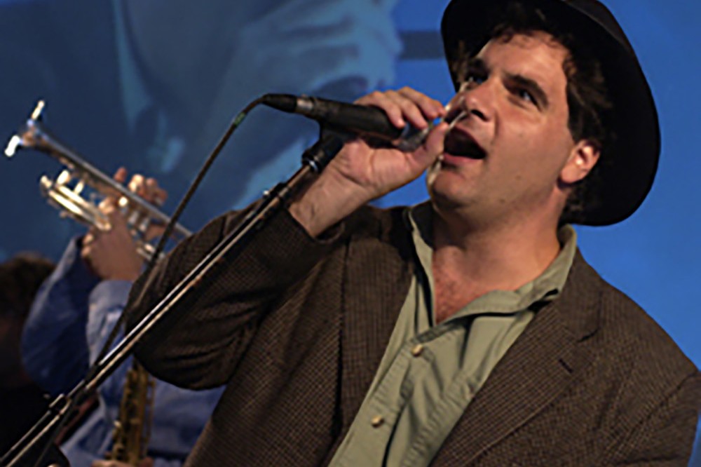 Joe Fornieri, RIT assistant professor of political science and front man for the rhythm-and-blues band, the Dynamics, performs with the group at RIT Academic Convocation on Sept. 4. -