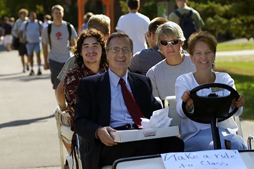 RIT President Albert Simone offers students a ride to class in the "Presidential Golf Cart" on the first day of classes, Sept. 8. Robin Diana, associate director of student transition and support, orientation and the First Year Enrichment program, drives. -