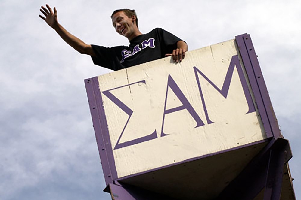 Patrick Goodell, a second-year finance student in the College of Business and Sigma Alpha Mu member, does his tour of duty during Pole Sit 2003. Fraternity members took turns sitting atop a 40-foot utility pole to raise money for the Make-A-Wish Foundation, Sept. 9-12. -