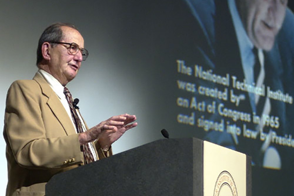 RIT Vice President Emeritus Alfred Davis showcased his knowledge of RIT and its history in a talk to the community, Sept. 17, discussing RIT's early history and those who helped make the university a reality. In his time at RIT, Davis served four of RIT's presidents and is a graduate of RIT's Class of 1941. The presentation was sponsored by the Nathaniel Rochester Society. -
