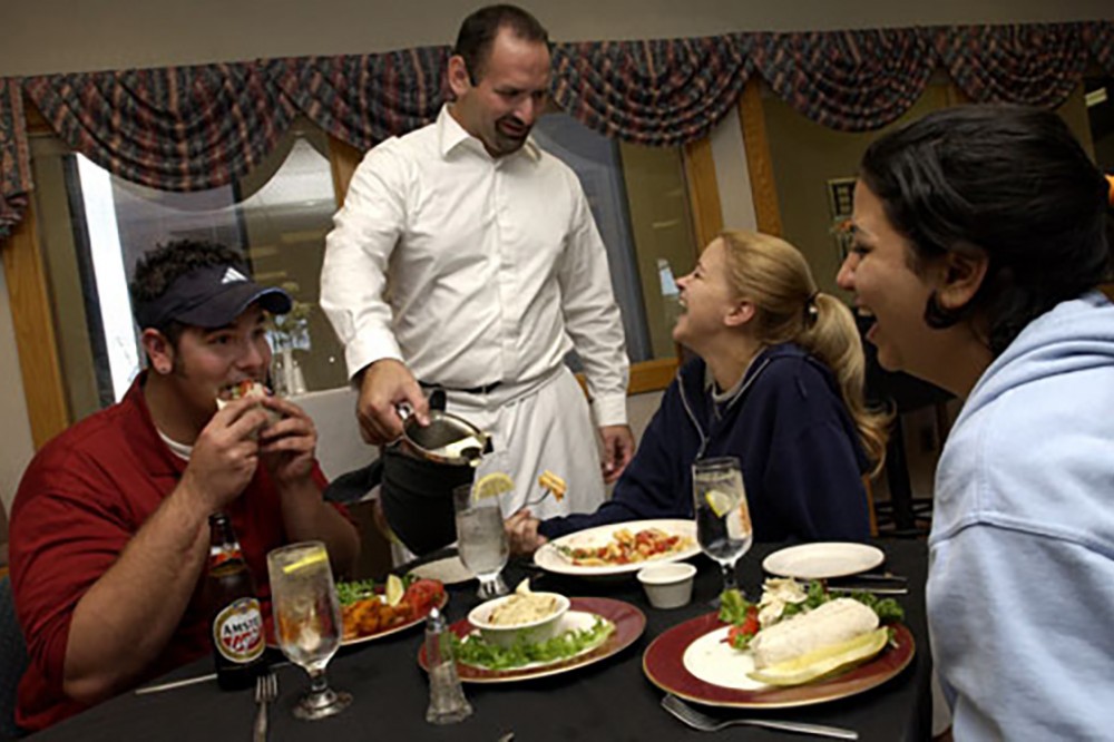 Drew Nye serves, from left, Vince Daneri, Shannon Bruton and Emily Julian at Henryâs, RITâs full-service, student-run restaurant, on it's first day open for fall quarter, Sept. 25. The eatery, now in its 21st year, features bistro-style lunches served 11:30 a.m.-1 p.m., Tuesdays and Thursdays through Nov. 11 on the fourth floor of the George Eastman Building. -