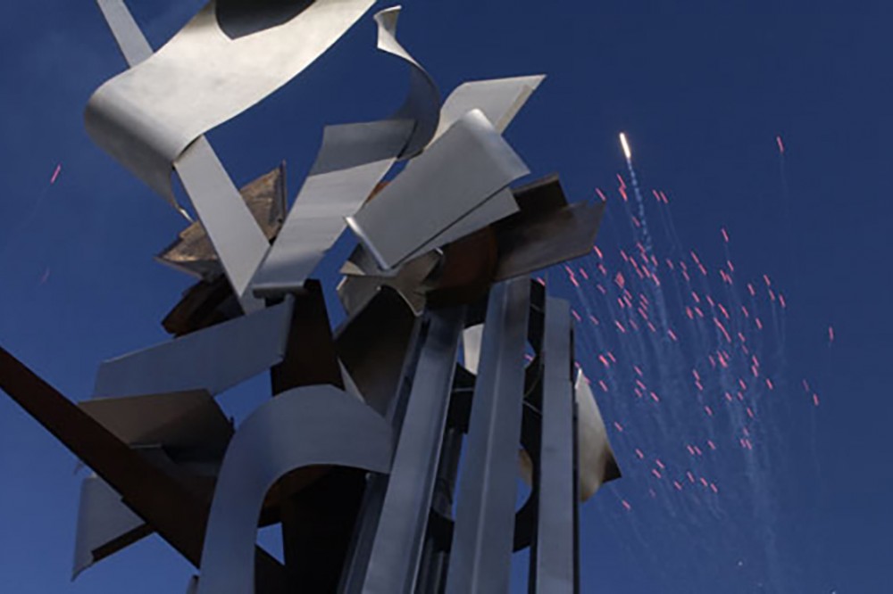Fireworks punctuate the Oct. 2 dedication of Albert Paley's largest sculpture, The Sentinel. The 110-ton, 73-foot artwork forms the centerpiece of a new pedestrian plaza at the heart of the RIT campus. More dedication photos. -