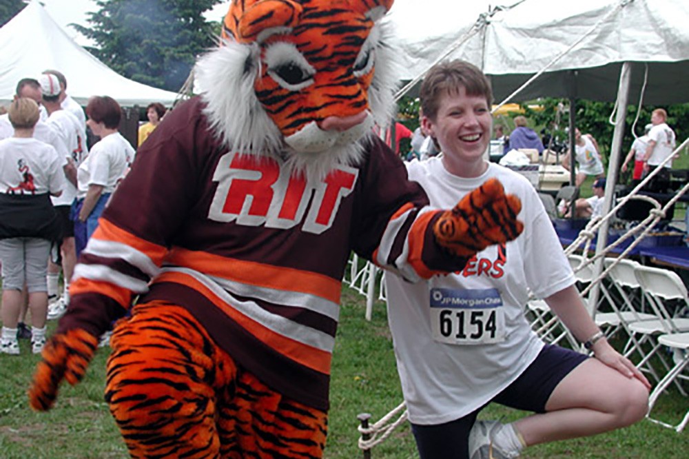 RITchie, RIT's Tiger Mascot, helps a runner prepare for the JP Morgan Chase Corporate Challenge with a little yoga, May 29. More than 200 RIT staff and faculty participated in the run/walk around Highland Park this year.