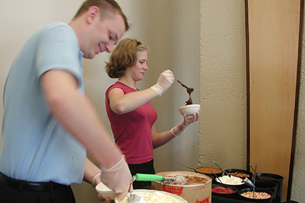 RIT Food Service student workers scoop ice cream during the United Way final recognition reception, June 11 in Fireside Lounge. The 2003 campaign exceeded its fundraising goal, raising just over $320,000, a 7 percent increase over last year. -