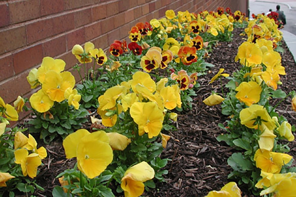 Pansies adorn the walkway alongside Wallace Library on the RIT campus. -