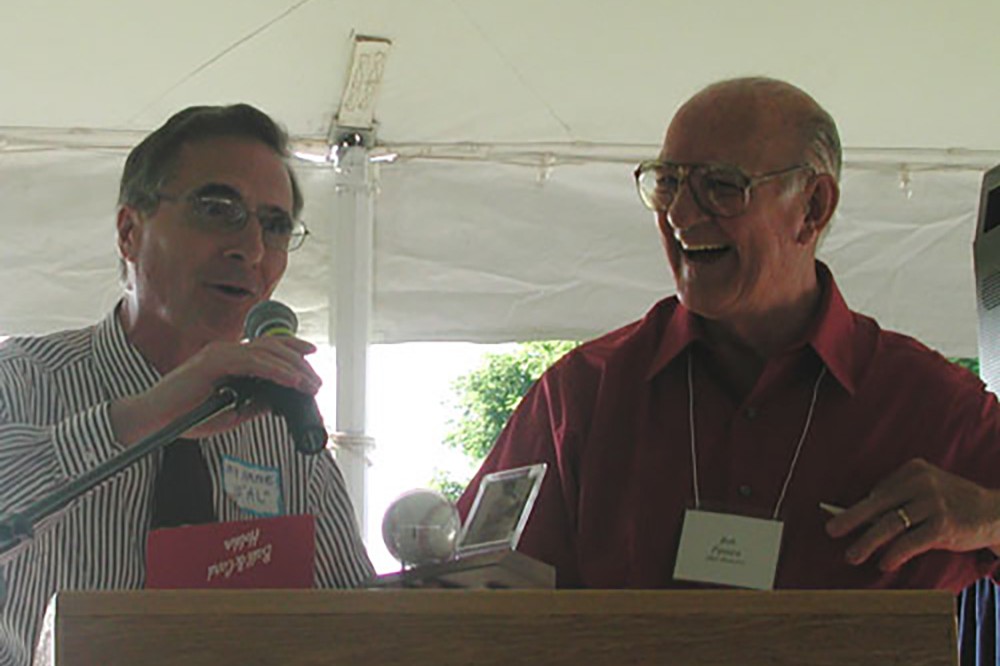 Robert Panara, right, is honored on June 18 as the RITiree of 2003 at the 5th annual retirees picnic. After receiving the award, Panara, professor emeritus and the first deaf educator at RIT, presented President Albert Simone with an autographed Boston Red Sox baseball. More than 500 RIT retirees, joined by 28 Class of 2003 RITirees, attended the picnic at Liberty Hill. -