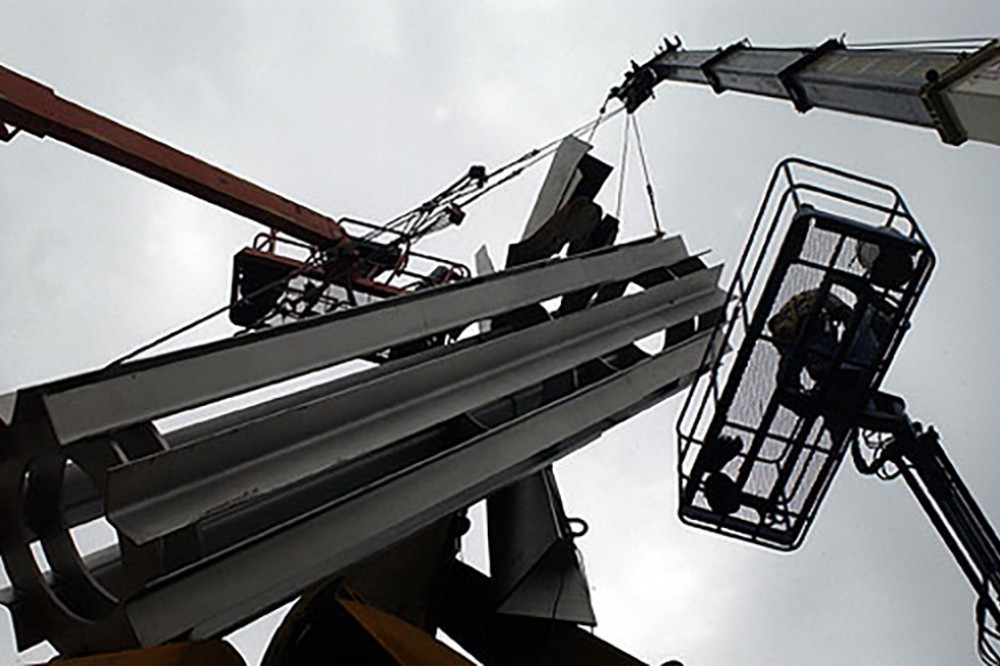 The last major component of Albert Paley's sculpture in front of the RIT Student Alumni Union is installed, July 7. The "cage" weighs almost 10 tons and sits diagonally to the arched base of the structure. According to Paley, "The Sentinel" will be the largest sculpture located on any campus across the U.S. -
