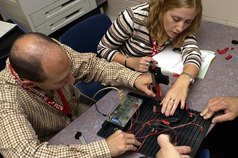 Anthony Pigis, a teacher at William E. Grady High School in Brooklyn, left, and Emily Bennett, from Fitzgerald High School in Warren, Mich., practice machine modeling in a Project Lead the Way teacher-training workshop on July 8 at RIT. Around 300 middle and high school teachers from across the nation will visit RIT this month for sessions on instruction of pre-engineering curricula that prepares students for college studies. -