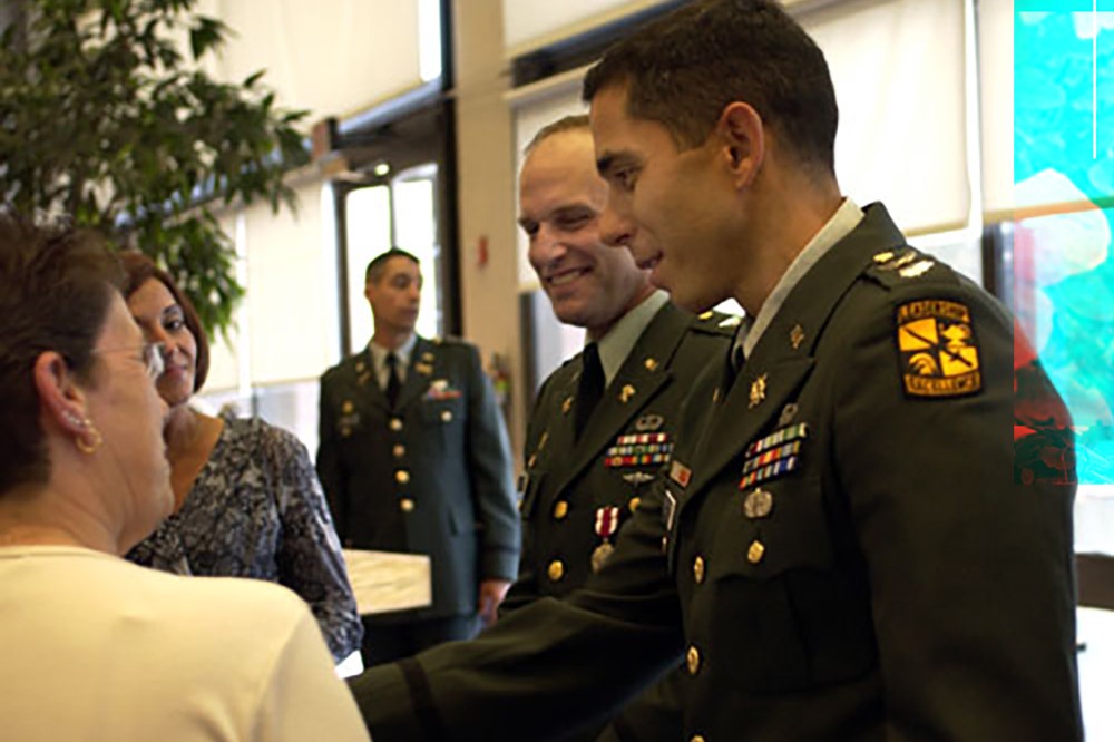 RIT Army ROTC held a Change of Command ceremony on July 23 in the Student Alumni Union Fireside Lounge. Lt. Col. Donald Beattie Jr., professor of military science, far right, assumed command of Tiger Battalion, 1st Brigade, from Lt. Col. Daniel Stafford, standing to his right. Stafford is remaining at RIT as assistant dean of the B. Thomas Golisano College of Computing and Information Sciences. -