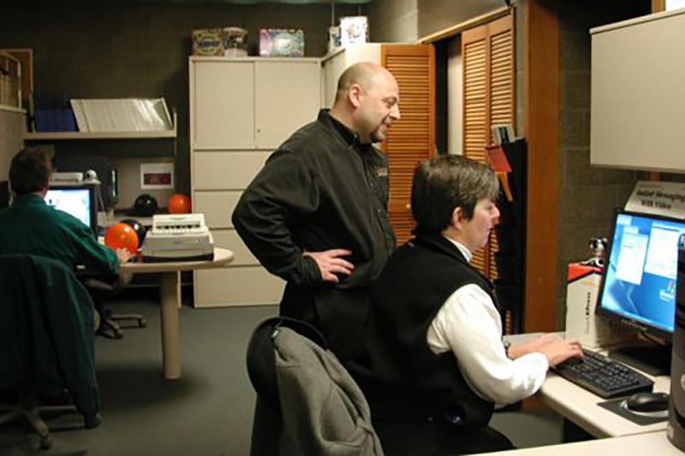 Bob Ertischek (standing) helps Christine Monikowski, associate professor at NTID, use Instant Messaging with video as she chats to Rico Peterson, chair of the ASL department at NTID (left) in Online Learning's Teaching and Learning Technology Lab during their Tech or Treat Halloween event, Oct. 31.