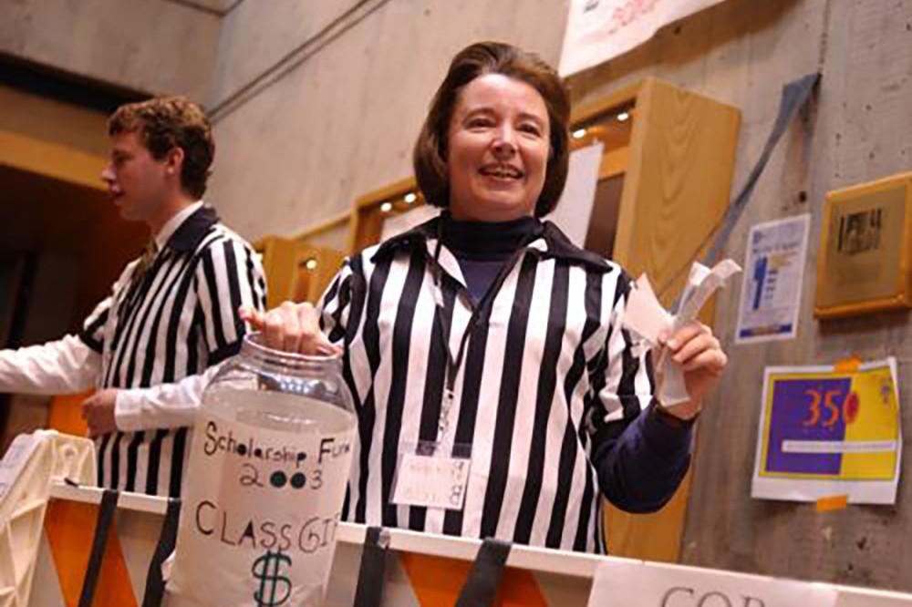 Marty Burris (right) and Bryan Hensel cajole College of Business students to help bail them out of COB County Jail, Oct. 31, to raise money for this year's class gift. -