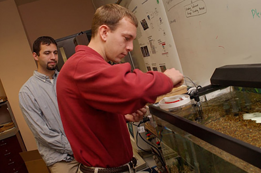 Joshua Hoiland, right, and Chris Bunk demonstrate their senior design invention, a remote aquarium monitor and control system, that enables light and temperature control and feeding via an Internet connection. They were among 16 RIT computer engineering majors who unveiled inventions on Nov. 5. -