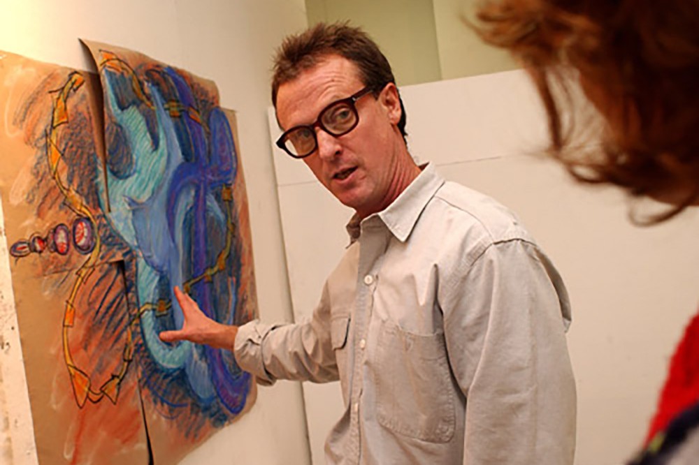 Internationally recognized painter and print maker David Row critiques student artwork while visiting Alan Singer's painting class, Nov. 7 -