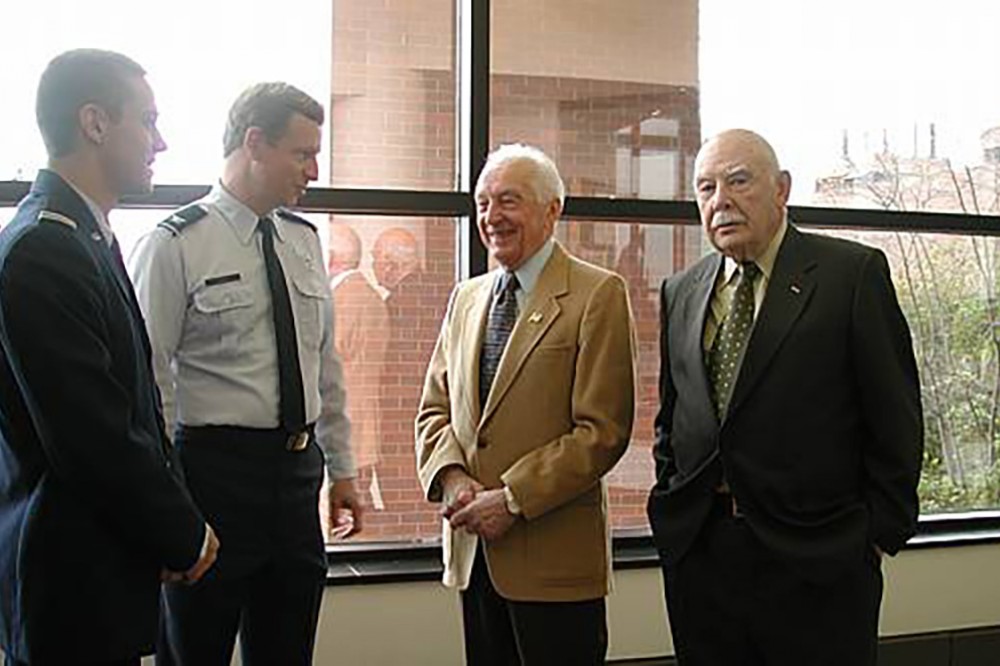 Two World War II pilots who graduated from RIT were honored at a Veteran's Day luncheon at the Chester F. Carlson Center for Imaging Science. Col. Thomas Burgie, (second from left) head of RIT's Air Force ROTC program, and ROTC student David Baker (left) chatted with Robert Kaplan (far right), class of '49, and Roy Brockman '41. Kaplan, who lives in Buffalo, flew B24s and was shot down over China in 1944; Brockman, of Rochester, flew a B17 on 35 missions in the European theater. -