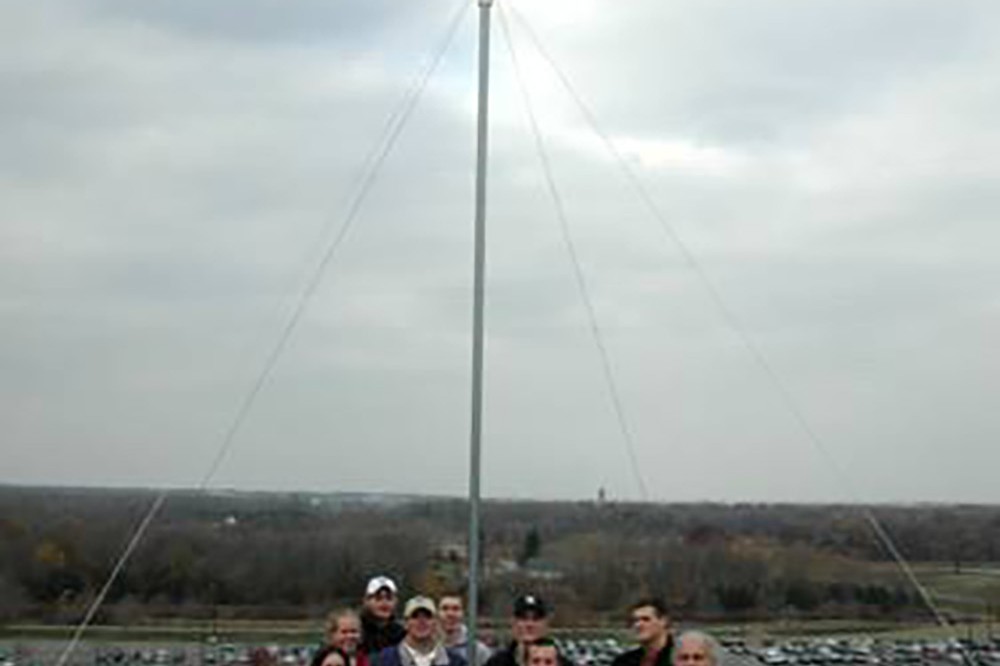 RIT professor John Morelli (on right) stands with his alternative energy sources class after erecting a 400 watt wind turbine on the roof of the Chester Carlson Center for Imaging Science building, Nov. 13. The wind turbine will stay for a year, to evaluate RIT's potential as a site for wind power. -