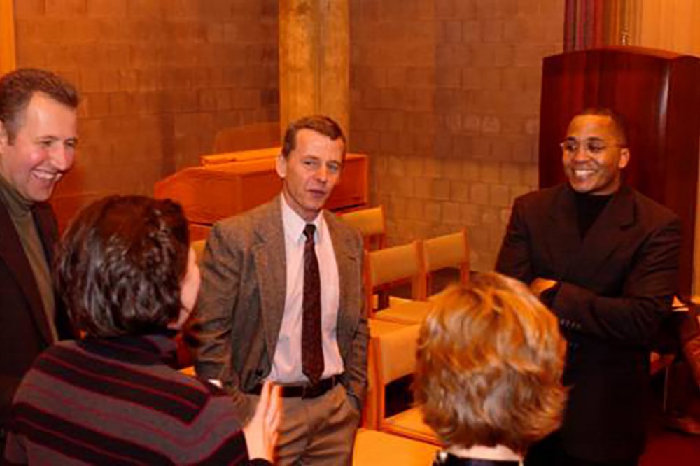 Brian Washington (right), WOKR-13 reporter and weekend news anchor, chats with Jeff Hering (center), director of the Center for Religious Life, and several of the center's ministers before the 19th Annual Thanksgiving Service, Nov. 19. -